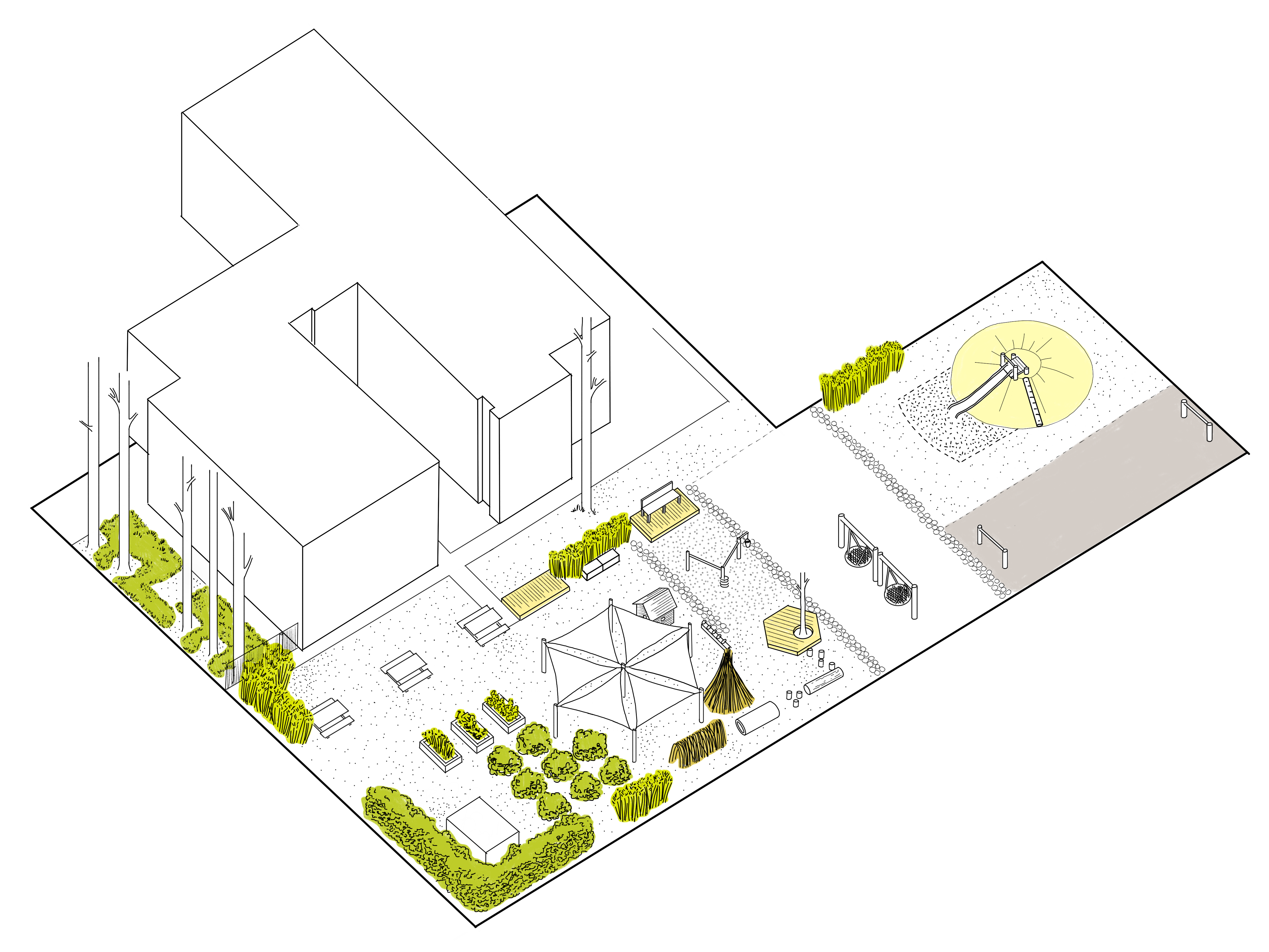 Uzupełnienie placu zabaw stanowić będą elementy architektury zielonej: szałasy z wikliny, drzewa, nasadzenia, byliny i krzewy, która będzie pełniła charakter naturalnej osłony przeciwsłonecznej.