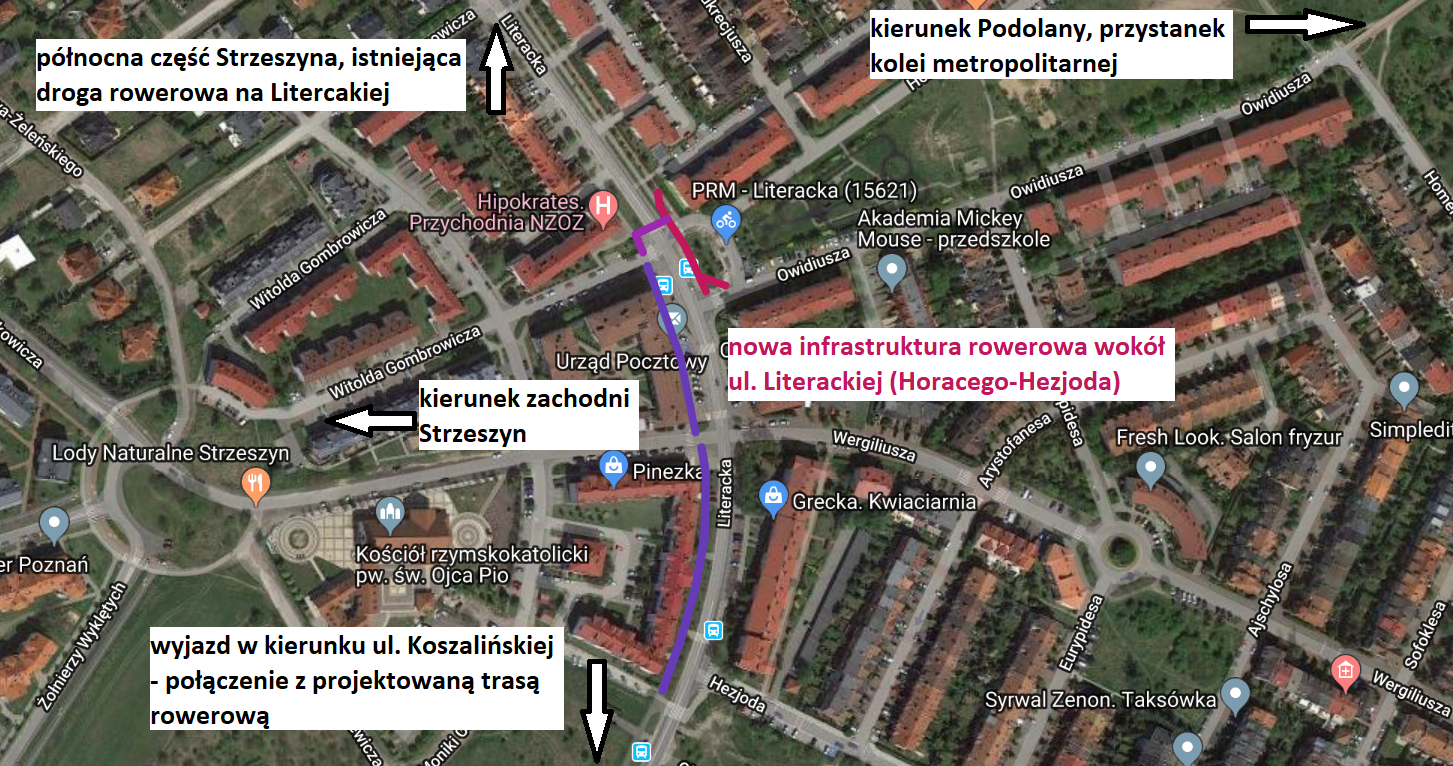 Literacka to kluczowa ulica na Strzeszynie, na której brakuje drogi dla rowerów od ul. Horacego do ul. Koszalińskiej. Utrudniony jest także bezpieczny osiedlowy ruch rowerowy pomiędzy Podolanami a zachodnią częścią Strzeszyna - brak bezpiecznego połączenia od Owidiusza do Wańkowicza. Projekt zakłada stworzenie ciągłej trasy rowerowej z północy na południe przez centrum Strzeszyna wraz uwzględnieniem łatwego wjazdu na ul. Gombrowicza, Owidiusza i Wańkowicza: