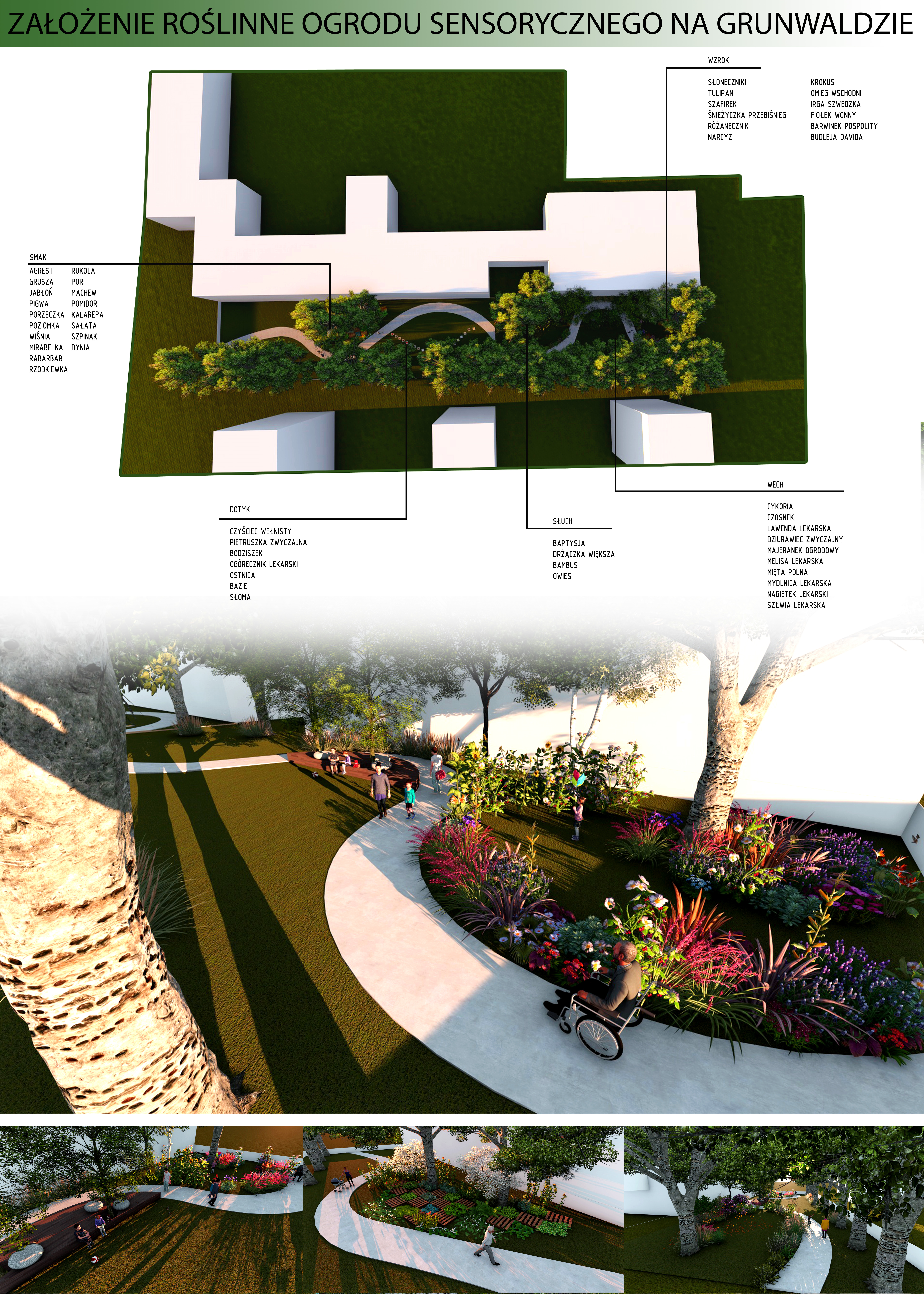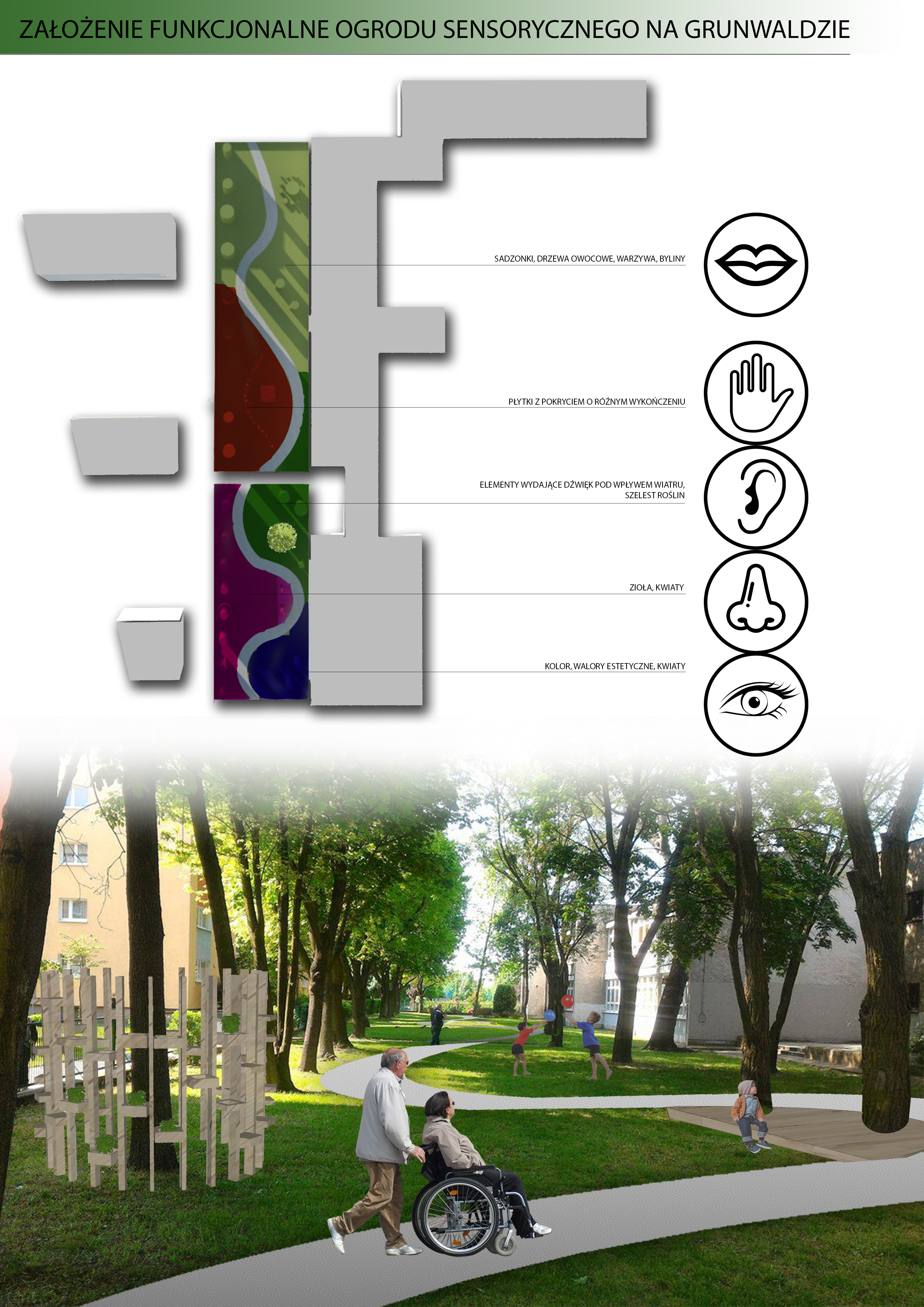 Ogrody sensoryczne to tzw. kompleksy ogrodów tak zaprojektowane, aby w sposób zintensyfikowany i celowy oddziaływać na zmysły pozawzrokowe. Wchodząc w taką przestrzeń będziemy mogli wykorzystać nie tylko zmysł wzroku i powonienia, ale także dotyku, smaku i słuchu. Przestrzeń w ogrodzie będzie dostępna dla osób niepełnosprawnych w tym także dla osób niewidomych. Tak przygotowane miejsce będzie dostępne dla każdego. W ogrodzie pojawią się kwiaty, owoce i warzywa oraz trawy i krzewy ozdobne. Ogród będzie nie tylko miejscem wypoczynku i zebrania energii, ale także skarbnicą wiedzy o roślinach. Przedsięwzięcie obok przygotowania infrastruktury, nasadzeń i oznaczeń będzie w sobie zawierać prowadzenie warsztatów dla uczniów i mieszkańców miasta na temat pielęgnacji roślin i ich praktycznego zastosowania. Część ogrodu będzie przeznaczona do kolektywnej uprawy roślin jadalnych, dzięki czemu projekt będzie miał także charakter integrujący lokalną społeczność. Opisy roślin będą wzbogacone o nakładkę w języku Braille'a. Chodnik poprowadzony wzdłuż ogrodu będzie wygodnym korytarzem komunikacyjnym dla osób na wózkach inwalidzkich i z wózkami dziecięcymi. W części ogrodu ulokowana będzie tzw. ścieżka sensoryczna, czyli pola o zróżnicowanej fakturze stworzone z różnorodnych materiałów. Taka ścieżka oprócz wrażeń estetycznych pomaga kształtować wyobraźnię poznawczą u dzieci. Projekt zakłada także przygotowanie podłoża oraz modernizacje płotu. Wdrożenie specjalnego systemu pozwoli na zagospodarowanie wody deszczowej do podlewania roślin, co znacznie obniży koszty utrzymania ogrodu i pozytywnie wpłynie na środowisko. Projekt będzie wzbogacony o technologię Internetu Rzeczy (IoT - ang. internet of things) dzięki czemu ogród będzie można monitorować, zdalnie sterować oraz prowadzić w nim badania przyrodnicze i społeczne na temat rozwoju roślin i relacji międzyludzkich. Przestrzeń towarzyszącą zajmą urządzenia zabawowe i sprzęty do ciczeń na powietrzu tak by zielona przestrzeń pomogła zintegorwać maksymalnie różnorodne grupy mieszkańców.