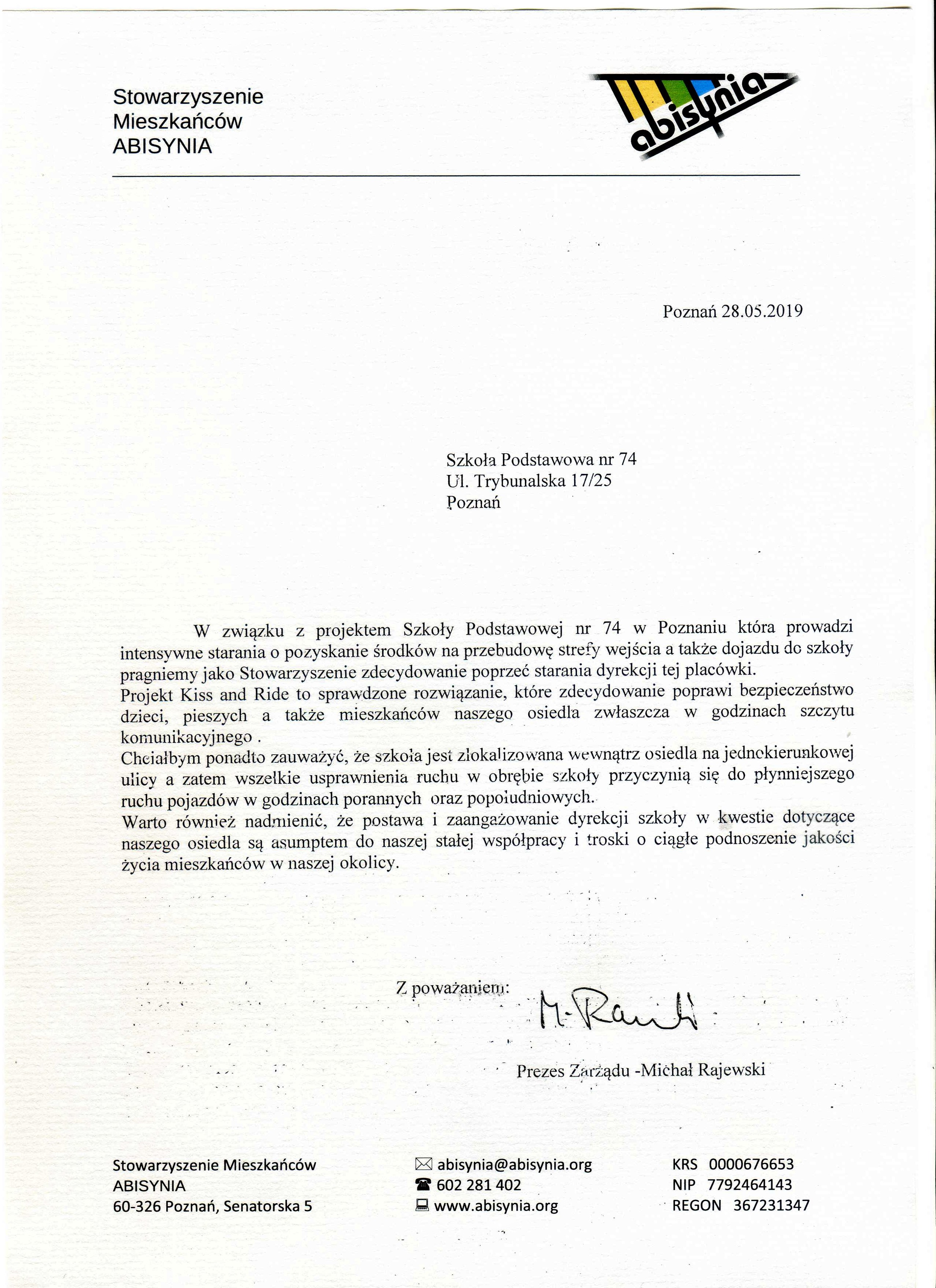 Treść odwołania: Otrzymałam informację, że projekt PBO 2020 nr 222 Kiss&Ride został negatywnie rekomendowany przez Wydział Oświaty, z uwagi na negatywną opinię Miejskiego Inżyniera Ruchu. W opinii Miejskiego Inżyniera Ruchu miejsce w rejonie wejścia do Szkoły Podstawowej nr 74 w Poznaniu powinno służyć głównie komunikacji pieszej, a nie samochodowej. Nie zgadzam się z tą decyzją z kilku powodów. Po pierwsze projekt nie wprowadza żadnych dodatkowych zmian. Ma on na celu remont istniejącego stanu, który jest w bardzo złym stanie. Po drugie ma na celu uspokojenie ruchu samochodowego w okolicy szkoły i został pozytywnie rekomendowany przez Stowarzyszenie Mieszkańców Abisynia (załącznik do projektu). Uważam, że mieszkańcy osiedla Kasztelanów nie rekomendowaliby projektu, który zwiększałby ruch samochodowy w okolicy ich posesji. Po trzecie nikt z ramienia Miejskiego Inżyniera Ruchu nie pojawił się w okolicy szkoły na tzw. wizji lokalnej i nie rozmawiał ze mną o ewentualnych utrudnieniach, stąd domniemanie, ż decyzja została podjęta pochopnie bez dokładnej analizy. Po czwarte projekt remontu strefy wejściowej Kiss&Ride przy Szkole Podstawowej nr 74 w Poznaniu został złożony do Urzędu Wojewódzkiego w celu uzyskania pozwolenia na budowę. W związku z powyższym proszę o ponowne przeanalizowanie przesłanego projektu. W razie pytań jestem do dyspozycji.